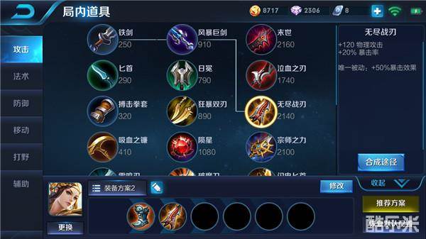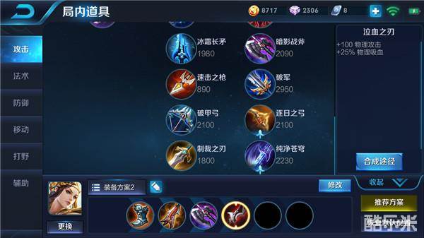 暗影战斧和泣血之刃增加的物理攻击可以让虞姬在中期的伤害大幅度提升,并且暗影战斧还可以减少虞姬技能一定百分比的冷却时间,让虞姬拥有更多的机会释放自己的技能,而且泣血之刃增加的物理吸血还可以提高虞姬与敌人作战时的续航能力,结合暗影战斧的被动效果可以让虞姬的普通攻击对敌人造成伤害时,有一定几率将敌人减速,利用这一特性可以让虞姬对敌人造成更多的伤害,并且暗影战斧还可以为虞姬增加物理穿透效果,即使面对坦克英雄,虞姬也可以用自己的技能和攻击结合物理穿透效果持续的消耗敌人。