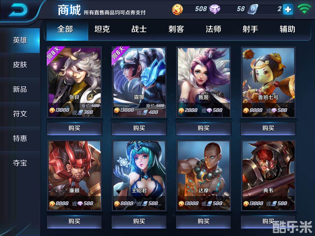 商城中的英雄可以说是最全的,当然也有一些特殊英雄只能通过特殊途径获取,商城中可以购买的英雄一般可以通过金币、钻石、点券这三种方式来购买,三种货币的获取在之前的攻略中已经介绍过了,在这里要说的是如果你是非人民币玩家,可以遵从能金币购买的就不要用钻石来购买,能钻石来购买的就不要用点券来购买。大部分英雄还是可以通过金币支付来购买的,价格一般在2888、5888、8888、13888在之后还会出现18888金币的英雄。