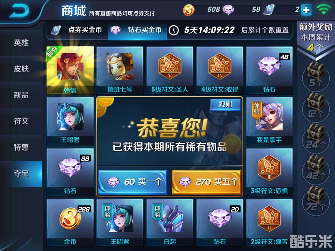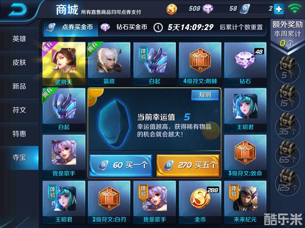 有些特殊英雄是购买不到,比如说武则天、韩信这两位英雄就需要抽取,在商城夺宝页面中可以选择点券抽取和钻石抽取,每抽取一次幸运值增加1个,幸运值越高获取英雄的几率也就越大,钻石夺宝和点券夺宝规则一样。