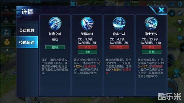 被动-杀意之枪:韩信的第四次普通攻击将会对目标造成击飞效果,并且韩信在释放技能命中目标后,将会获得额外的攻击速度加成。