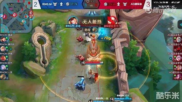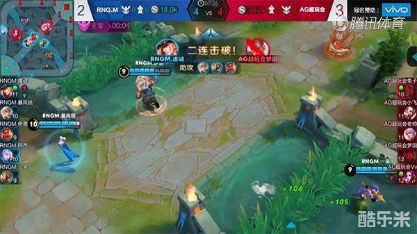 7分45秒,AG超玩会四名队员推进中路一塔,这时RNGM.一笑抓住敌方走位靠前的时机,用二技能成功控制住两人,RNGM.虔诚快速使用二技能赶到战场,配合队员进行输出,这时AG超玩会梦泪看到无法逃脱,准备强杀马可波罗,被RNGM.虔诚走位成功躲过,最终拿下双杀。