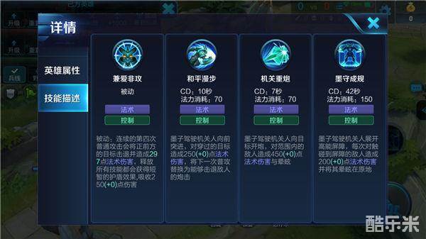 总结:墨子最强势的时期就是在中后期,因为他利用自己攻击距离的优势,可以最大程度上限制敌人的状态,也让我军团战更加容易取胜。