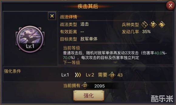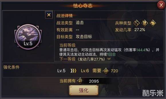笔者选择由朱儁佩戴了1级战法【疾击其后】和5级战法【怯心夺志】,其中【怯心夺志】的账面伤害为144%,【疾击其后】的账面伤害为40%~70%。