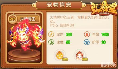 与“周周礼”一同上线的,还有《弹弹堂手游》新橙宠“火精灵王”。火精灵王作为掌控火焰的君王,拥有媲美其它橙宠的强大属性和专属技能,而火精灵王目前的唯一获取方式只有通过周周礼的累计礼包赠送。每周当玩家领取达到指定的每日礼包后,可领取装有火精灵王碎皮的累计礼包!