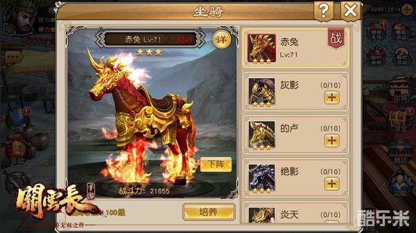 《关云长》手游为各位主公准备了超酷炫的数匹良驹,赤兔、的卢、灰影、绝影等绝世好马都等着主公们成为它们的伯乐,带领它们征战沙场。坐骑的加入,将直接提升主公的战力值。主公们不仅能在城池中或世界大地图上策马奔腾,同时在各种副本任务中,坐骑也将与主公共同作战。