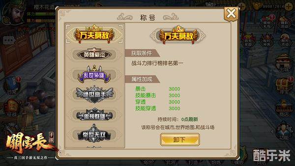 游戏新增时装系统,各位主公可以收集各种时装,穿戴时装后天命武神的外貌也会随之改变,时装也会给主角带来新的实力。同时《关云长》手游为各位主公准备了个性称号,称号会直接显示在玩家的头顶,装备不同的称号可以给主公带来不同的属性。