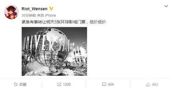 管理LPL选手的拳头官方工作人员文森在微博上低价转售五张环球影城的门票。
