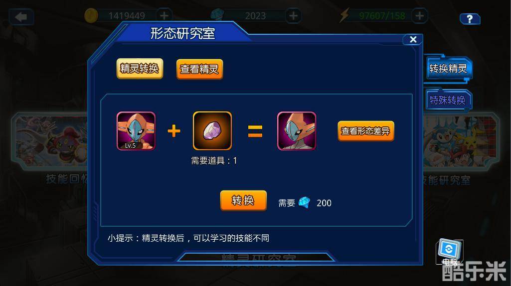 另外还将更新全新的形态转换功能上线,可以为有形态的精灵转变形态,选定精灵后使用对应的形态道具可以直接把精灵转变为对应的形态。特殊转换形态的精灵同样可以在特殊转换分类中查看转变形态的方式,比如裂空座、盖欧卡、骑拉帝纳;选定精灵后可以点击查看形态差异按钮直接查看精灵即将转换的形态的能力差异。形态转换为可逆操作,转换后可以通过同样的操作转换回原形态。