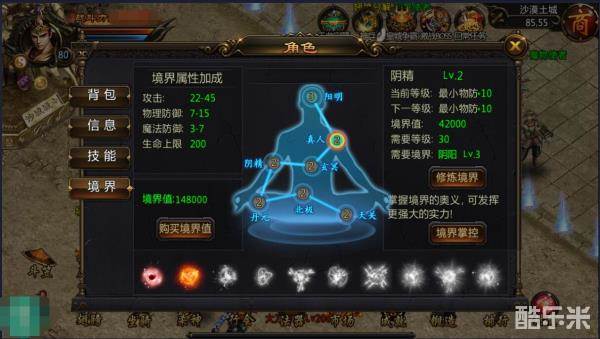 境界系统是《屠龙诀》战力提升的一个重要途径,每提升一重境界,对玩家的战力提升都有相当大的加成。阳明提升生命、阴精提升最小物理防御值、真人提升最大物理防御值、玄冥提升最小魔防值、丹元提升最大魔方值、北极提升最小攻击值、天关提升最大攻击值。只有将上一层的境界系统修炼完成才能修炼下一层。7层境界都修炼完才能提升一重天境界,继续修炼下一重天的境界。