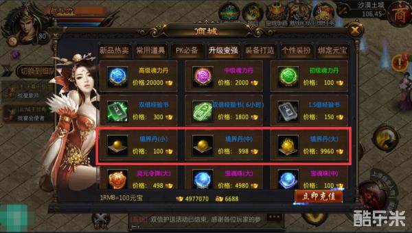 (3)吃境界丹,可以通过赚取绑定元宝,在绑定元宝商城购买境界丹(小),但每天限使用10个,共计获得20万点境界值。当然你还可以在元宝商城里面购买境界丹(中)和境界丹(大),每一个分别可获得10万点和100万点境界值,而且不限使用次数,能快速提升境界。非R玩家也不用气馁,也可以通过快速冲级获得元宝奖励来购买。