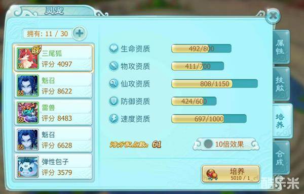 您可以通过选择单次培养或10倍培养的方式消耗一定数量的灵狐仙丹道具来经行灵宠培养,培养可提升当前灵宠资质,资质的提升最终影响灵宠属性。资质共分为5类:生命资质、物攻资质、仙攻资质、防御资质、速度资质。