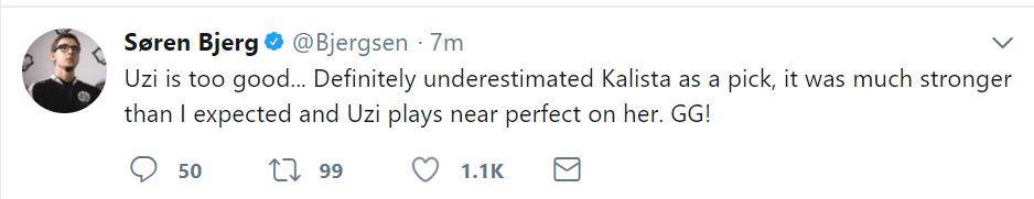 在刚刚结束的全明星solo赛决赛中,Uzi以2-1战胜Bjergsen,卫冕solo赛的冠军,捍卫了solo King的称号比赛结束后,Bjergsen发推表示Uzi玩的太好了:
