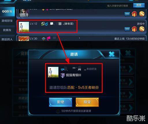 这是一位钻石段位的“学生党”玩家分享的一组图片,您的好友XXX(谢老湿)邀请您组队匹配·5v5王者峡谷,看来这老师也是知道抱大腿,知道邀请了自己的学生,他不会拒绝,就让他带自己飞一把。