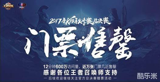 2017年KPL秋季赛总决赛门票于今天中午12:00开始正式售卖后,召唤师们全军出击,同时在线抢票的人数高达600万人,近万张门票在12分钟内售罄。