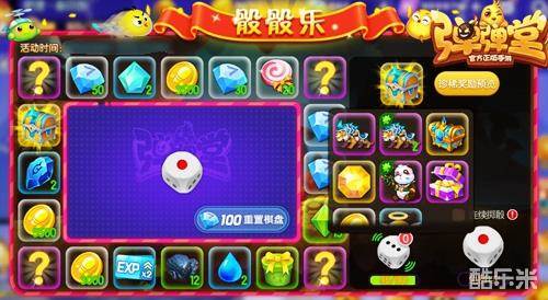 《弹弹堂手游》“骰骰乐”玩法的游戏界面设计得非常简洁,长方形的内外两个框架,其中外框中是满满的各种礼品,其中包括钻石、金币、强化石和各种礼盒,最高级的宝箱更可能开出紫色坐骑碎片、5级强化石等珍稀奖励哦。中间则是一颗大大的骰子和写着弹弹堂的底色背景。