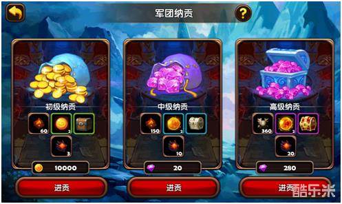 3、军团活动。军团活动又分为军团营地、军团副本、军团纳贡和神兽祭坛。其中,军团营地可派出佣兵供军团成员租赁;军团副本可供团员进行副本攻打,并赢取相应的装备等奖励;军团纳贡则可以通过消耗货币,对军团等级进行提升;至于神兽祭坛,则可通过消耗军团币解锁神兽,从而得到加攻加防等被动技能。