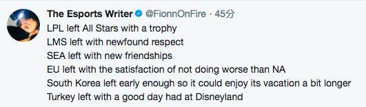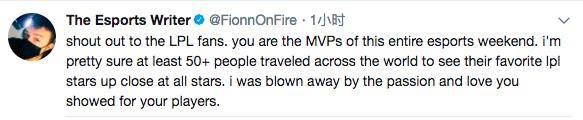 2017年全明星今日落幕,在最后的决赛中,LPL赛区梦之队以3:2的比分战胜了LMS赛区梦之队,夺得本届全明星赛冠军。今日比赛结束后,ESPN记者FionnOnFire在推特上表示LPL的粉丝们的热情让人震撼。