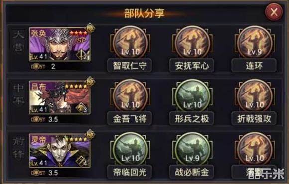 本队由SP张奂、汉吕布和灵帝三个武将组成,相对都比较容易获得。