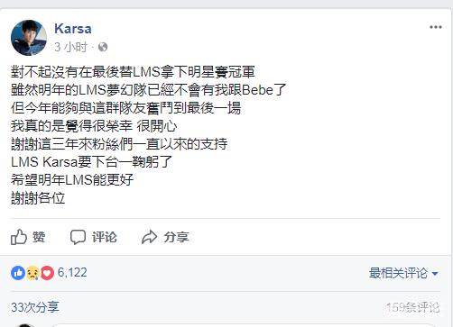 LMS全明星队员Karsa在决赛中负于LPL全明星后更新Facebook: