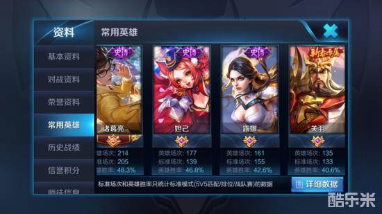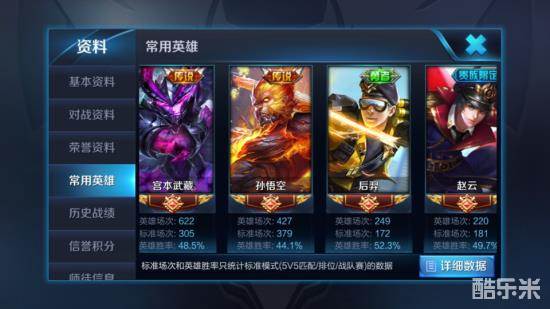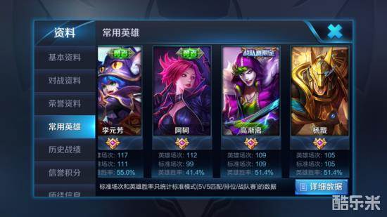 在没有满级熟练度的英雄中,李元芳、高渐离、杨戬的胜率稍微过了50%,而阿珂只有41%的胜率,可以看到一个特点就是这几个英雄都是玩了只不过100多把而已。