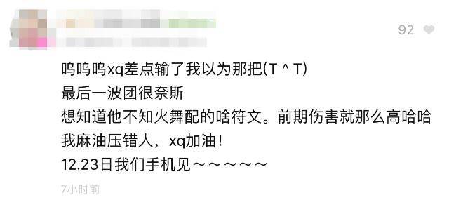 这位昵称为“世纪小迷妹”的网友评论道:“我以为XQ差点输了,最后一波团真的很奈斯,想知道他不知火舞配的啥铭文,前期伤害那么高。”