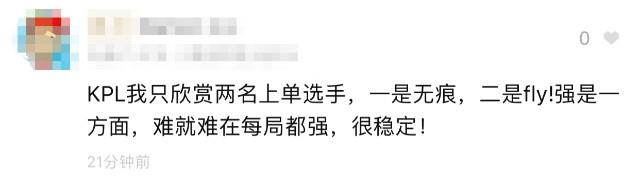 这位昵称为“Damon”的网友评论道:“KPL我只欣赏两名上单选手,一是无痕,二是Fly,强是一方面,难就难在每局都强,很稳定!”