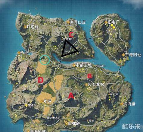 如图蓝点,可以选择这种偏中心的小建筑群落地,我个人比较喜欢标注的蓝点,离四个大城市不远不近,挨着中枢桥,跑毒打野都比较方便。(abcd比较适合组排)