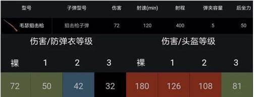 毛瑟狙击枪有着高额的单发伤害和超远的射击距离,是所有狙击枪中最常见并且比较实用的狙击枪,以下是这把枪的参数:
