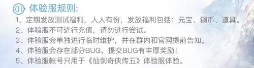 《仙剑奇侠传五》手游体验服会定期发放测试福利,以供参加体验服的籼米更好的深入体验最新的活动玩法等。因为体验服内会存在少许BUG,籼米可以在“仙剑五体验测试群”中提交BUG与建议,并得到官方发放的丰富奖励。