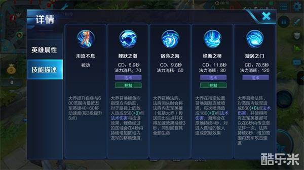大乔的一技能可以击退路径上的所有敌方单位,而大乔的三技能更是可以让范围内的全部敌方单位进入到沉默状态,使其无法释放技能,大乔的二技能可以传送自己和范围内的全部队友回到泉水中,大招可以将全部队友集中在指定位置,可以说大乔是一名拥有强大辅助技能的英雄。