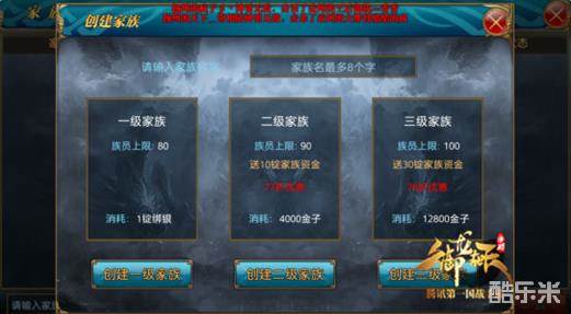 首先你需要根据实际情况创立你自己的家族,一个好的有含义的名字是必要条件。因为对一个家族长而言,家族的名字往往意味着你本身所想要表达的游戏理念,所以一个好的名字是前提,家族创建可消耗1D绑银创立一级家族,当然如果你想要有更好的发展可直接消耗金子创建高等级的家族。