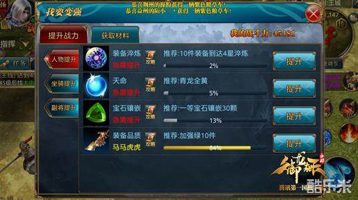 1.用以提升装备品质的紫色水晶可以通过参与游戏活动获得,此外还可以合成获得紫装,和通过击杀本国BOSS获得,先搞清楚材料的免费渠道有哪些之后,就千万不要错过。装备品质的提升是战力提升的第一点。