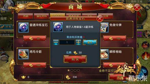 2.每天可使用金券购买普通淬炼、坐骑普通淬炼,不断的积攒。中淬合成符等道具可通过参与国战、游戏内的各种节日活动而获得,获得之后切记一定要静下心攒材料,等待后续提升装备的星级。此外,家族淬星不仅成功率高并且不掉星哦,记得每天点一点。