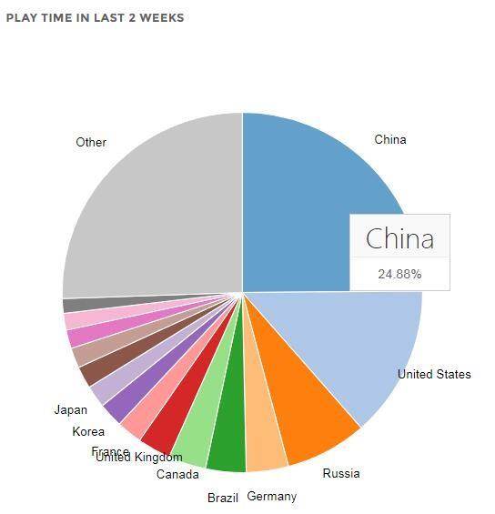 近日根据SteamSpy的最新统计显示,过去两周,Steam上中国活跃玩家数量和游戏时长均完爆其他国家,位列第一。数据显示过去两周,中国活跃玩家数量占据了Steam活跃玩家数的19.48%,美国则以14.71%位列第二。游戏时长方面,过去两周中国玩家游戏时长以24.88%的占比排在第一,位居第二的美国玩家游戏时长占比13.66%。