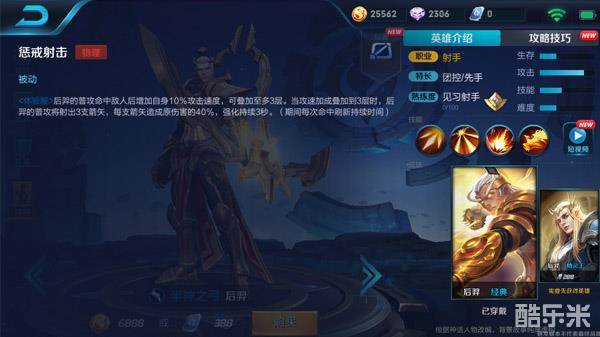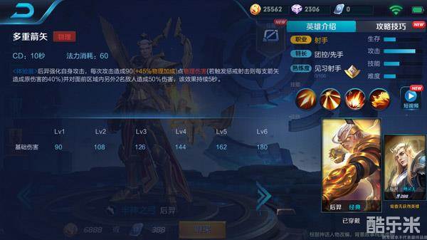 分析:后羿的定位就是一个需要攻速,站桩输出型的射手,而被动则可以为后羿提供攻速叠加,让他可以打出更多的伤害输出。另外被动同时射出多支箭矢的机制,强化了后羿的清理兵线能力,以及后期团战的输出能力。