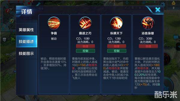 解析:增益技能,开启时可以造成一定的范围伤害,同时为自己增加攻击力和韧性,而且在持续时间内,曹操主动造成的伤害都能为他回复血量。这是保证曹操持续作战能力的核心,在实战中尽量用作先手使用,这样与敌人消耗的时间越久,我方就越容易拿下团战的胜利!