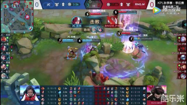 JC对阵RNG.M的败者组第二轮比赛第一局拿出姜子牙体系,在比赛进行到4分08秒时,JC姜子牙、貂蝉和韩信三人凭借队伍人头和经济上的双重优势来到RNG.M野区红BUFF处进行反蹲,就在RNG.M达摩和马可波罗想将红BUFF拿下时,JC貂蝉先手入场干扰两人,姜子牙从左侧草丛出来释放一、二技能限制达摩的移速,此时韩信迅速切入成功反到红BUFF并配合姜子牙的大招击杀达摩。JC姜子牙配合韩信在草丛埋伏敌人进行击杀的套路不止拿出过一次,却每次都打出了优异的效果。