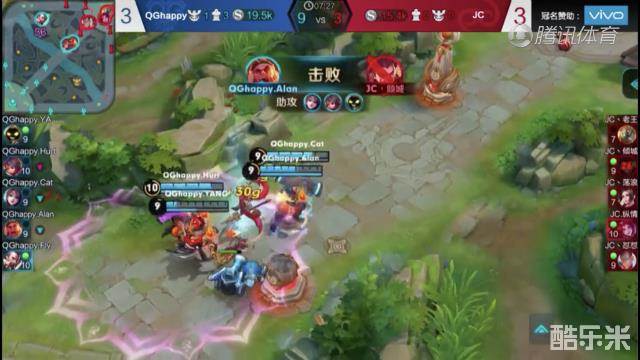 QGhappy对阵JC的胜者组决赛决胜局当中,QGhappy在拿出苏烈打野之后又拿出太乙真人作为辅助,这两位英雄一个能在队友的帮助下进行复活,一个能帮助队友进行复活并且都带有控制技能。在比赛进行到第7分16秒时,苏烈和太乙真人见JC不知火舞还没有上线直接带领队伍越塔强杀JC聚集在中路的四人,JC哪吒在被苏烈的大招击飞后又遭受到了苏烈猛烈的普攻最先丧命,JC的中路一塔也丢失,随后太乙真人和苏烈不断利用自身控制限制敌方突进英雄的进场,配合队友将JC打出团灭。
