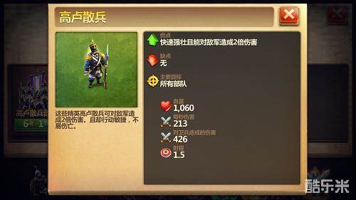在启蒙时代,由拿破仑缔造的法兰西帝国军队一直是欧洲大陆上的王者之师,而高卢散兵便是启蒙时代的最强步兵。其对于部队的伤害为双倍,在攻伐作战时,可作为骑兵的后盾以及弩炮马车的防御。而且其强力的攻击对于摧毁建筑也十分有效,在战术搭配上十分灵活,无论是突袭还是推进都十分强劲。