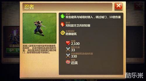 忍者为扶桑忍者演化而来的特殊高级兵种,邪魅一般的身影可穿梭在敌方阵营中。在游戏中,其可无视建筑伤害。而且忍者的优先攻击目标也是防御建筑,其功能类似于启蒙时代特殊兵种游击队,在进攻时其可作为尖兵进行突破,可极大程度帮助获取战斗胜利。