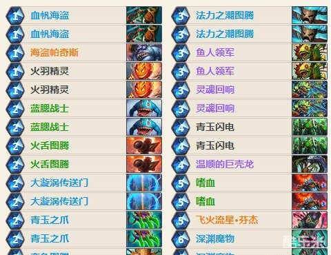 和传统的嗜血铺场萨满一样,外挂了帕奇斯海盗体系和青玉体系且编满了双嗜血。海盗体系采取了两张微软加帕奇斯,增加了天湖的胜率。青玉体系和传统的加基森青海萨一样,上线的66的青玉魔像,加强了对中后期卡组的抗性。鱼人体系采取了芬杰领军蓝腮和两张蛮鱼图腾。还加入了一张文顺的巨壳龙润滑了鱼人体系。带了双嗜血使得可以打出更强的爆发,面对中后期卡组也可以一波偷鸡带走。
