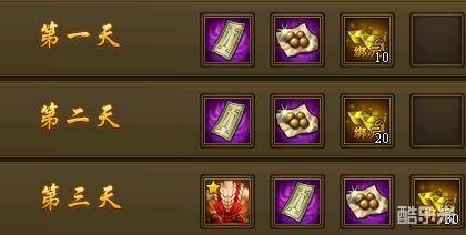 第三天登陆我们可以领取副本卷轴1个(可以进入单人战甲副本、单人内甲副本、单人驯兽副本、四象玄门、九泉之下、冰宫城内的必备道具)、1.5倍圣心丹(双击开启获得一个小时的双倍打怪经验,时间可以叠加)、绑定元宝300个、江湖英雄铠限时卡,超级披风属性非常强悍,对于我们战斗帮助非常大,美中不足只能使用24小时。