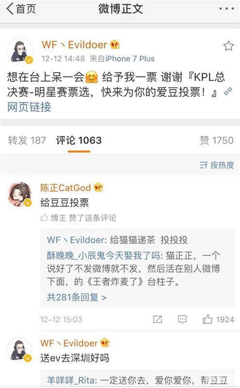 在粉丝们四处拉票的同时,这些选手们也没有闲着,可爱的一豌豆就直言想在舞台上站一会,KPL交际花猫神就第一时间送上宝贵一票,WeFun众队员也纷纷在微博为其拉票。