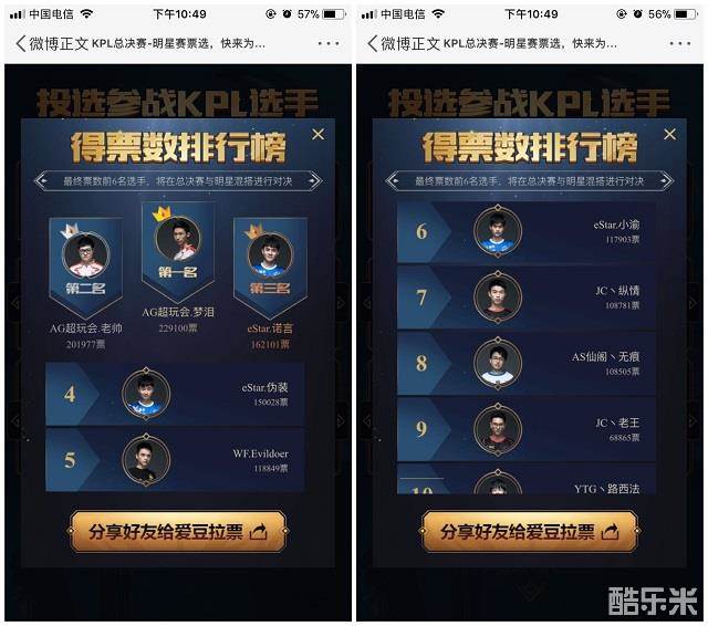 截止统计时间2017年12月13日晚10:20,榜单前六名分别是AG.超玩会梦泪,AG.超玩会老帅,eStarPro.诺言 ,eStarPro.伪装, WF.Evildoer ,eStarPro.小渝,投票时间截止12月19日,排在后面的选手也不是全无机会哟,大家赶紧疯狂的为自己的爱豆拉票吧!