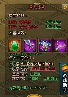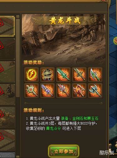 黄龙斗战每天16点到16点30,22点到22点30开启,副本内产出大量装备,金刚石和寒玉石,宝石用来镶嵌装备。而整个黄龙斗战副本分为3层,每层都有不止一个BOSS,玩家想进入下一层必须收集一定数量的黄龙斗令。