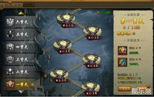 九重天关属于难度系数较高的副本,共9重,每一重都有18层,玩家要逐层通过。玩家不同等级段将挑战不同的重级,当然一般而言能把当前重级的18层都通关就很厉害了。如果已经通关层数,可以在第二天扫荡获取奖励。