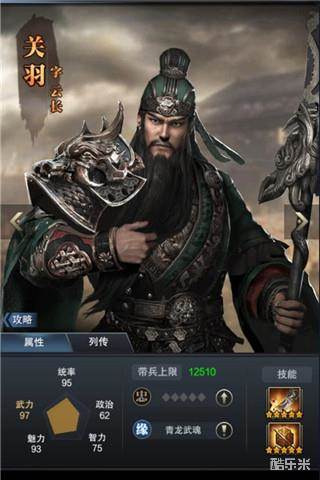 一代武圣的五维属性在武力、统率、魅力这三个方面的表现比较突出,技能更是能让敌军闻风丧胆。武圣满5级技能,在战斗的时候可以降低敌方士兵10%的攻击力,而且这个技能还能叠加使用,集结时多个效果叠加,将对敌军造成可怕的伤害效果。但,这个集结效果叠加是不超过50%的,也就是说,一个集结最多可以有5个关羽起作用。另外一个技能,是提升所在军团步兵的10%防御力,攻防两个技能双下,有了关羽,主公征战四方都能无敌!
