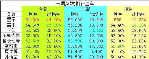 本数据可以让玩家对英雄的出场率和胜率的使用情况加以分析,可以更方便的了解当前版本强势英雄