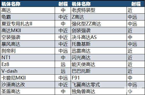 目前分类总共有五种,分别为“远”“中远”“中”“中近”“近”。从字面意思中我们就可以了解这五种定位分别指的是什么,大家可以在机体的选择菜单中轻松找到自己的机体所对应的定位。