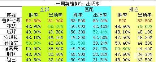 无论是胜率还是出场率,鲁班七号的人气遥遥领先于其他英雄,其中全部的排名中出场率第一高达81.90%,无论还是排位,出场率均超出80%,不过高出场率的同时意味着胜率会相对拉低,不够整体胜率达到52.5%,达到前五的水平。